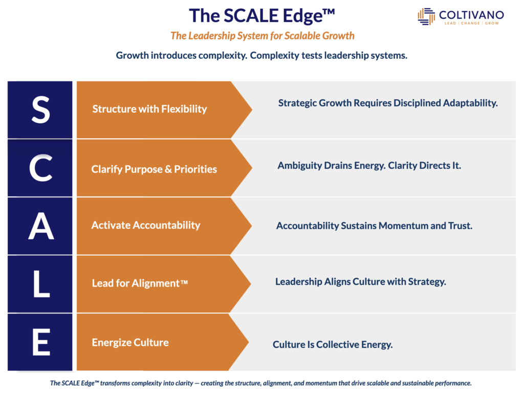 Within The SCALE Edge™, The Leadership System for Scalable Growth, these disciplines are expressed through structure with flexibility, clarity of purpose and priorities, activation of accountability, leading for alignment, and energizing culture as complexity rises.